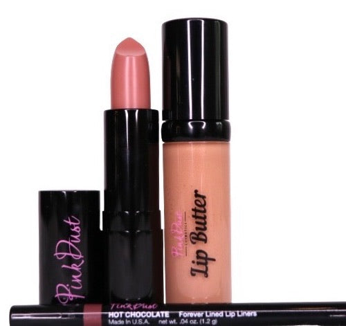 A rich blend of warmth and sophistication. Define with Hot Chocolate Liner, smooth on Bianca Lipstick for a soft, neutral contrast, and finish with Lip Butter Gloss for a glassy, sculpted sheen.